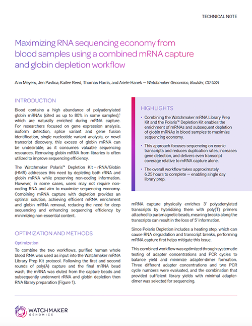 - Maximize sequencing economy by combining mRNA capture with globin and rRNA depletion to focus reads on informative, coding transcripts.