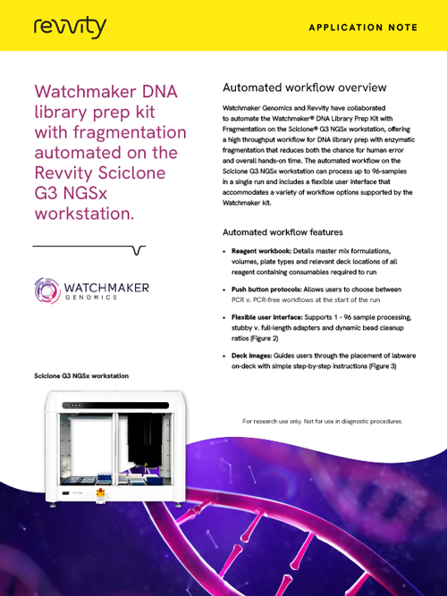 Watchmaker DNA Library Prep Kit with Fragmentation automated on the Revvity Sciclone™ G3 NGSx workstation